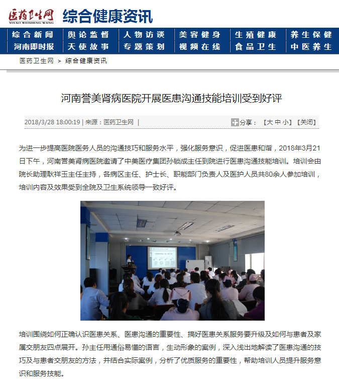 为进一步提高医院医务人员的沟通技巧和服务水平,强化服务意识,促进医患和谐,2018年3月21日下午,河南誉美肾病医院邀请了医疗孙锁成医生到院进行医患沟通技能培训。培训会由院长助理耿祥玉医生主持,各病区医生、护士长、职能部门负责人及医护人员共80余人参加培训,培训内容及效果受到全院及卫生系统一致好评。